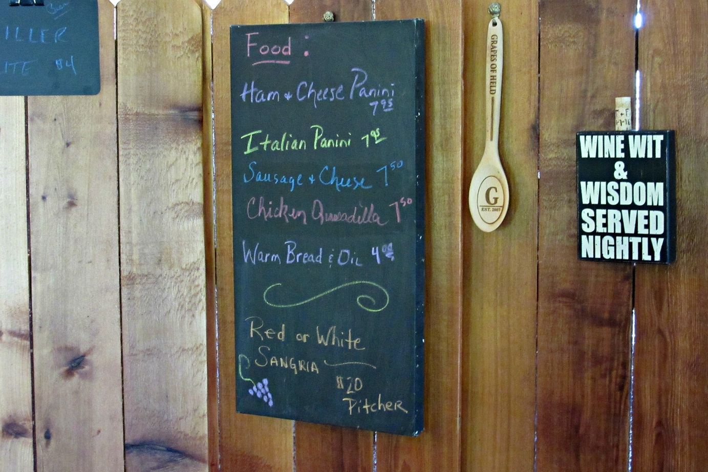 Inside the winery tasting room, there are several easy chairs as well as a few tables where you can enjoy any of several hot sandwiches they offer, as well as warm bread and oil for dipping. The menu also includes, in the fruit season, pitchers of sangria (from your choice of red or white wine). So a visit to Grapes of Held can offer both wine sipping and a light meal. The wine tasting bar is set up near the front door, where you can stand and taste samples of their wines as winemaker Fred gives a running history on the making of wine in Missouri, and fun anecdotes about life in the area.
